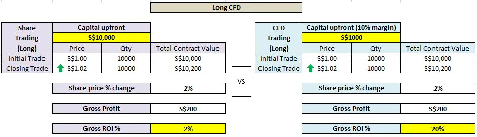 In the illustration above, you will earn a 2% gross profit* when your REIT’s share price appreciates by 2%. With CFD trading, your gross ROI can be magnified to 20% because you only need to commit 10% of the total investment capital upfront to gain full exposure to price movements.